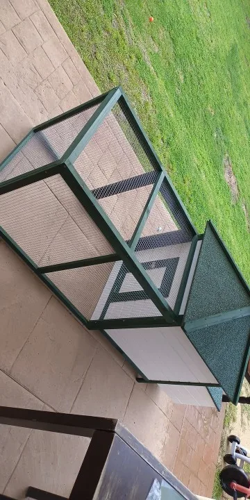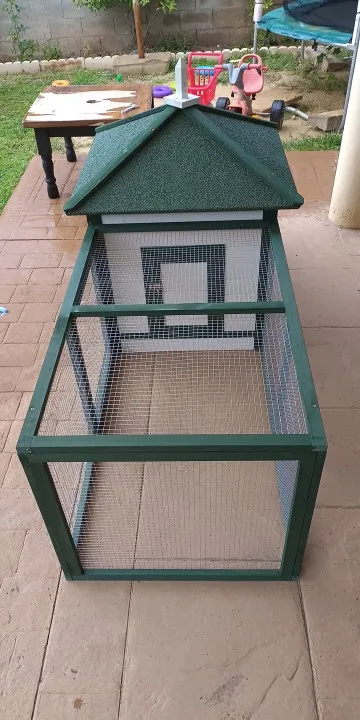 Structure en bois de sapin avec grillage métallique et toit bitumé hydrofuge (revêtement type shingle). Le nichoir dispose d’un couvercle ouvrant et la maison d’un tiroir à déjections pour un nettoyage rapide.