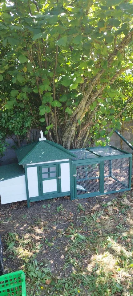 Un abreuvoir 3–5 L, une mangeoire anti-gaspillage, un perchoir supplémentaire si vous avez plus de 2 poules, bacs à poussière (cendre/terre diatomée), et un kit ancrage au sol en zone ventée.